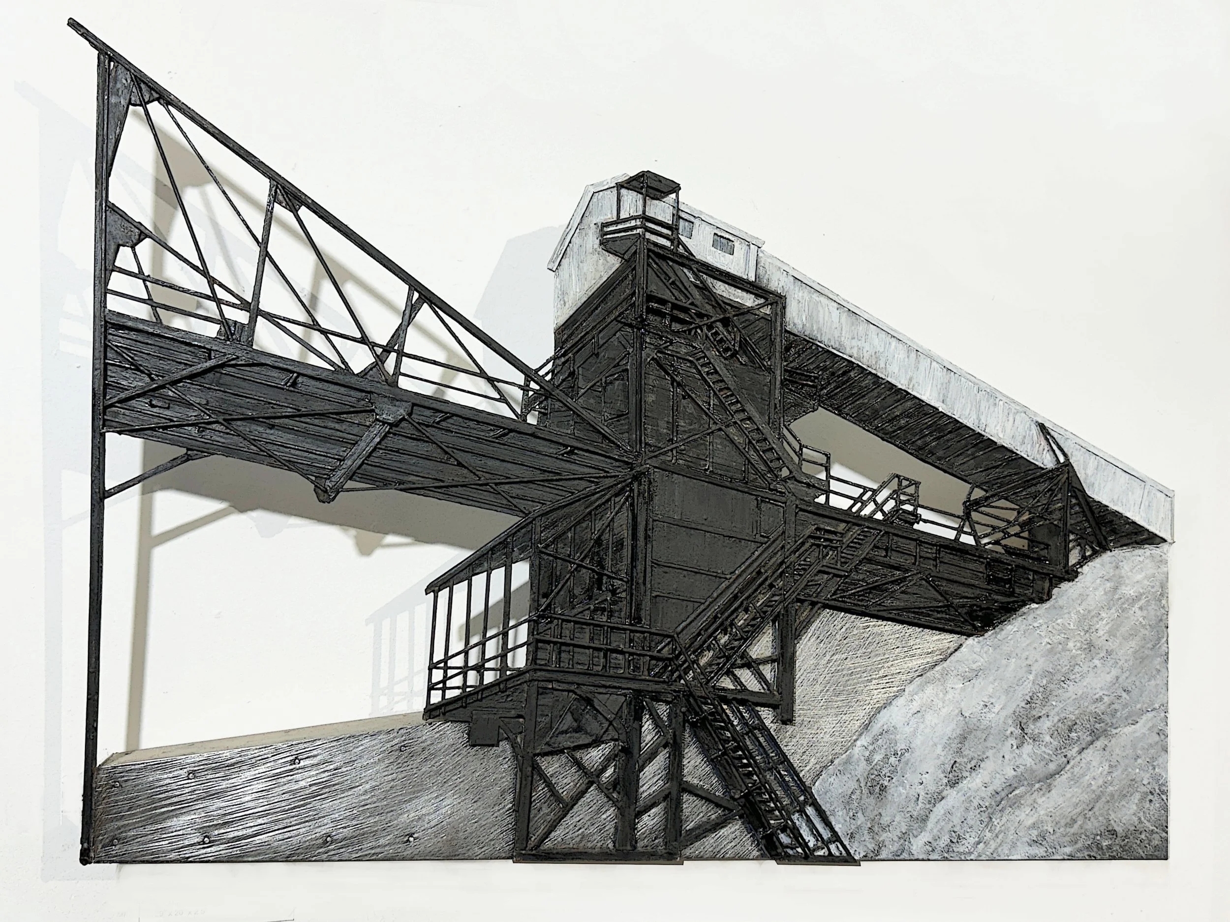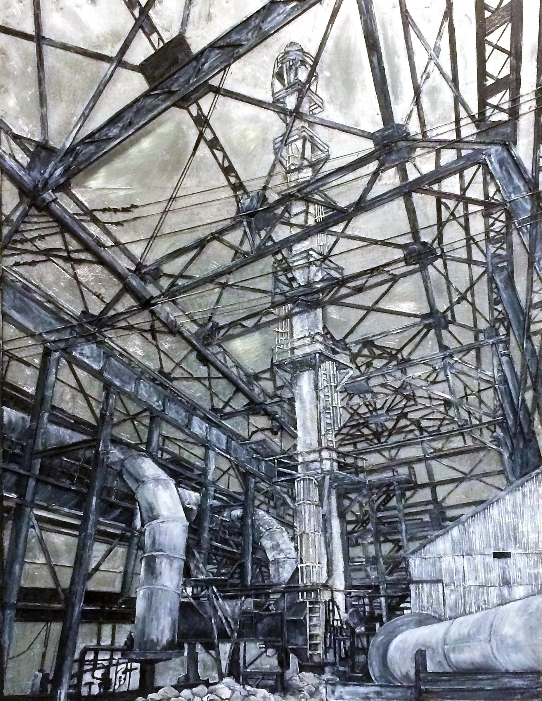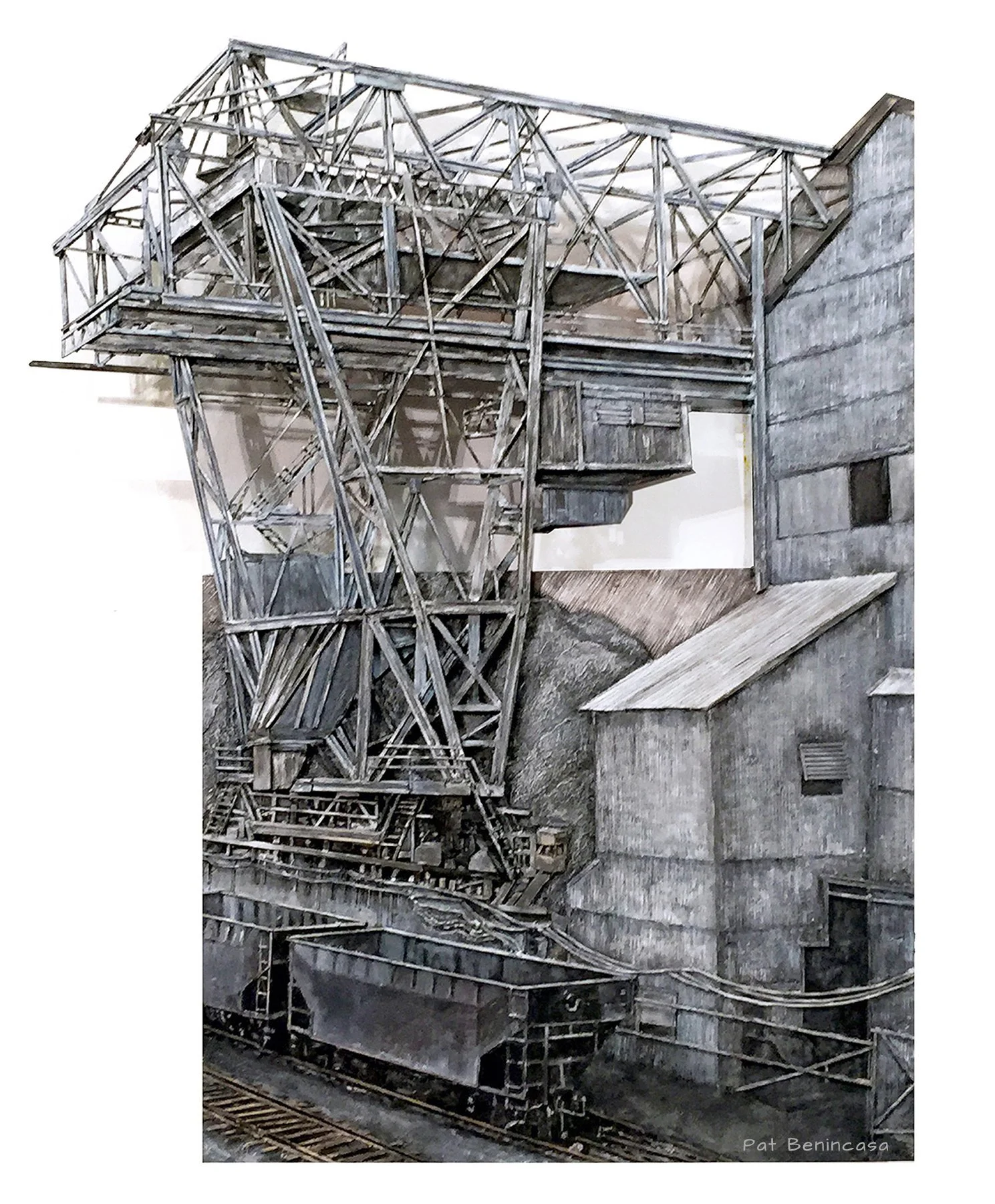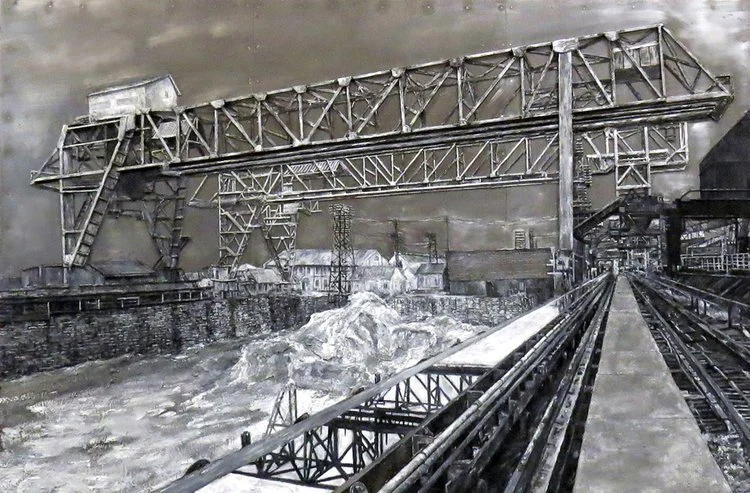 The structured imagery “floats” on sheet metal panels below. Note: This painting is based on the 1910 photograph by Ralph A. Dise, showing the ore-handling plant at Central Furnace. What struck me is the magnificent, stocking trestle with a 238’ span that acts like a sentinel, keeping watch over the works.