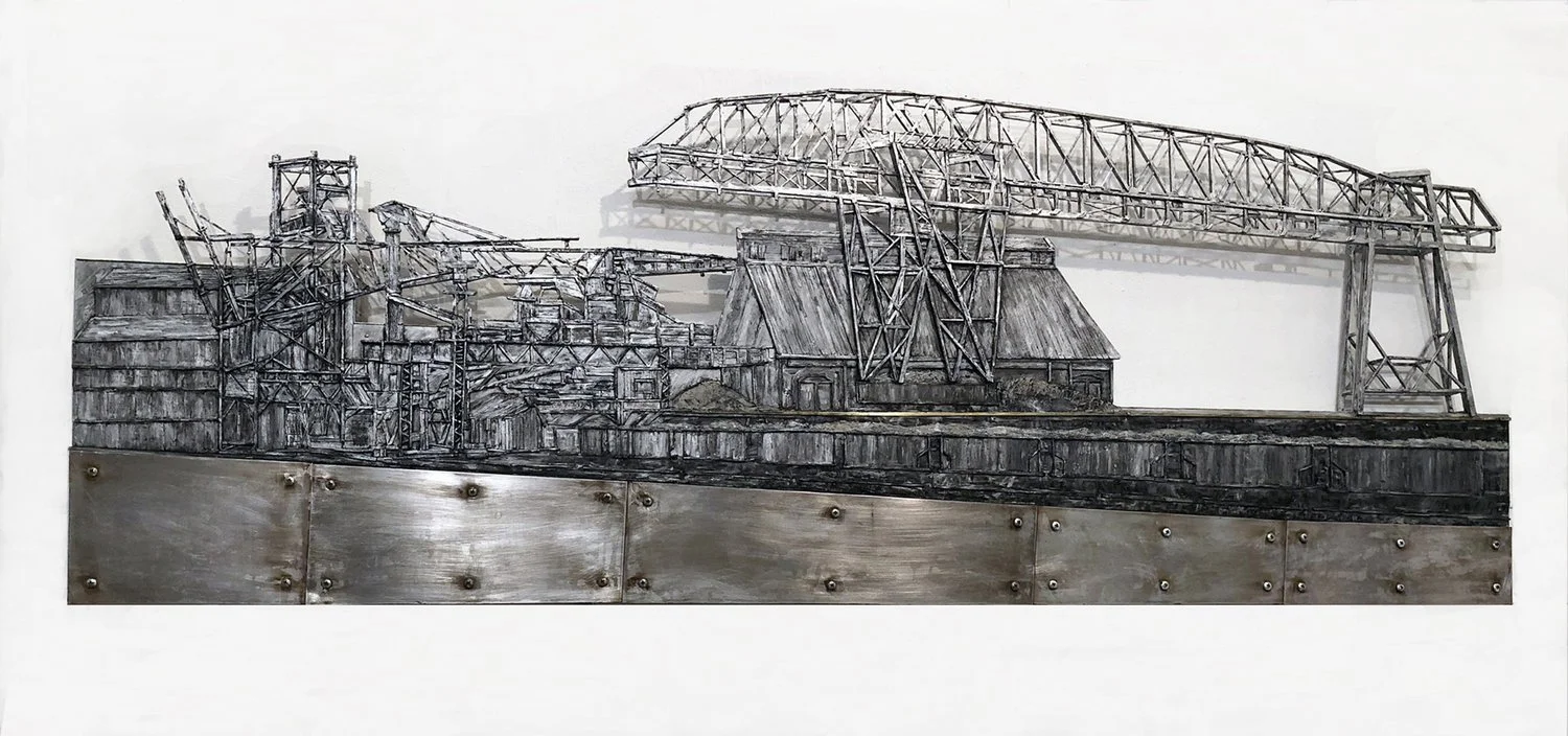 This image is from Bethlehem Steel Co. Blast Furnaces in Bethlehem, Pennsylvania. At the heart of my work is place as memory, reflecting a shared past that once acknowledged our national identity. It wasn’t enough to paint the industrial site, I poured marine varnish over the surface to make the image feel far away, and then scored deep lines into the sheet metal creating a fence. I wanted the scene to feel like a recollection.