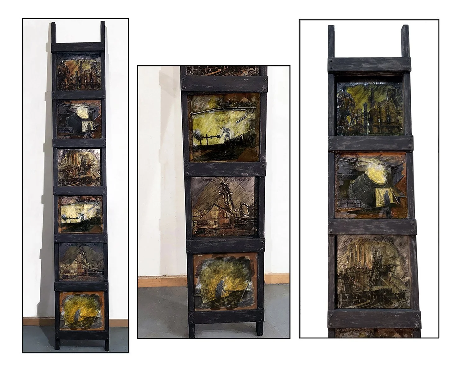 Ladder From Steel To Silence, 2018, 6 mixed media paintings on sheet metal in weathered ladder, 94” x14” 2.5.”