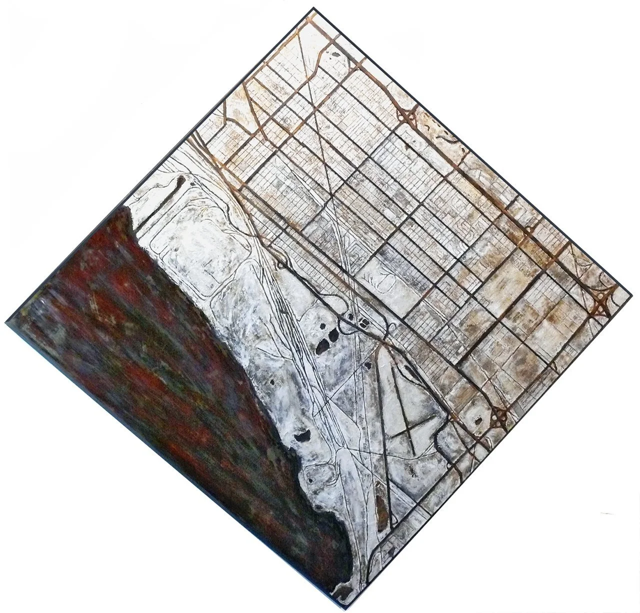 Detroit, 2010, Cement, rust, paint, encaustic on wood panel, 36” x 68” x 2.5”